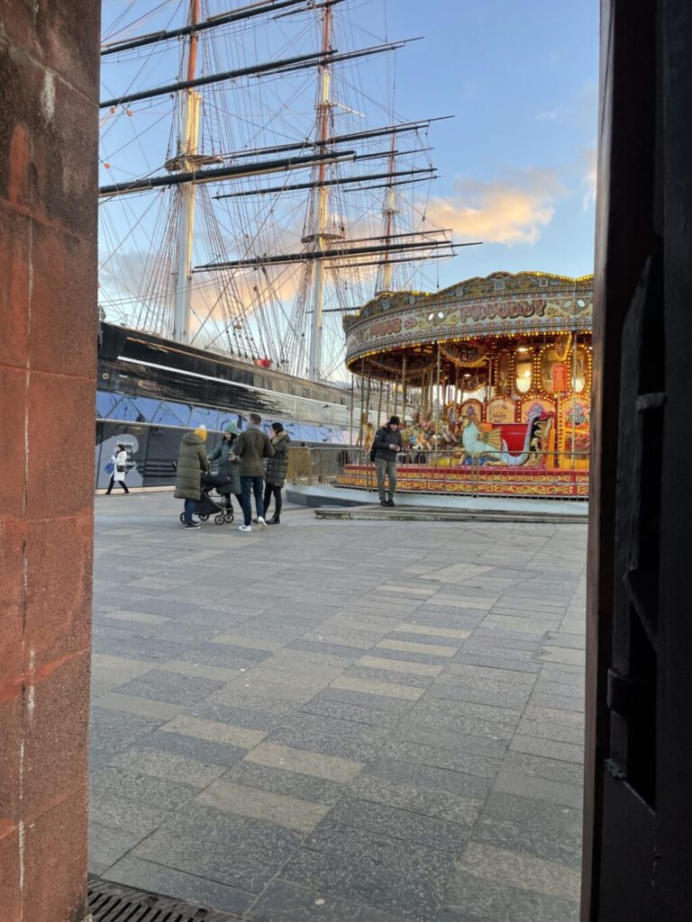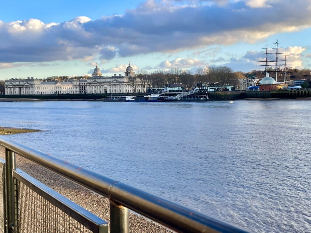 Mniej więcej w tym miejscu czeka na nasz rozmarzony wzrok kolejny bonus, w postaci malowniczej zabudowy Greenwich znajdującej się na przeciwległym brzegu rzeki. Jak bardzo malownicze jest to ujęcie wiedział już mistrz Canaletto, który to właśnie z tego miejsca w połowie XVIII-go wieku uwiecznił pejzaż Greenwich na płótnie. Stąd na tle nieba najpierw rysują się maszty słynnego żaglowca Cutty Sark (jedynego zachowanego klipera herbacianego na świecie) po nich imponujący gmach Old Royal Naval College z przepyszną kolumnadą niemal spływającą do rzeki, a pomiędzy nimi charakterystyczna zielonkawa kopuła niskiego okrąglaka.