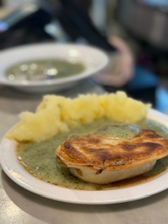 No i ja, która wchodzę cała na czarno (czytaj: z głodem i aparatem) zamawiając klasyczny zestaw – pie and mash z liquor. A że blondynka lubi wiedzieć, co je – podpytuję przemiłe panie z butefu.